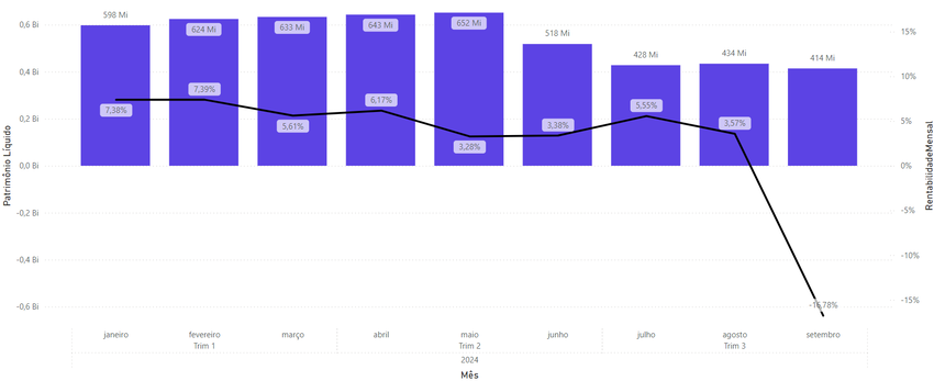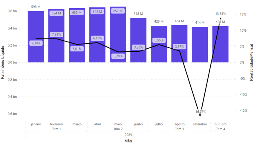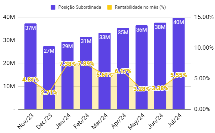 Em novembro de 2024, o Fundo Flagship reverteu parte das provisões feitas nos meses anteriores. Essa ação resultou em uma recuperação da subordinada, proporcionando um aumento de 27,33%. Com esse rendimento a subordinada recuperou e superou integralmente o patrimônio líquido anterior à queda de 16,78% no mês de setembro.